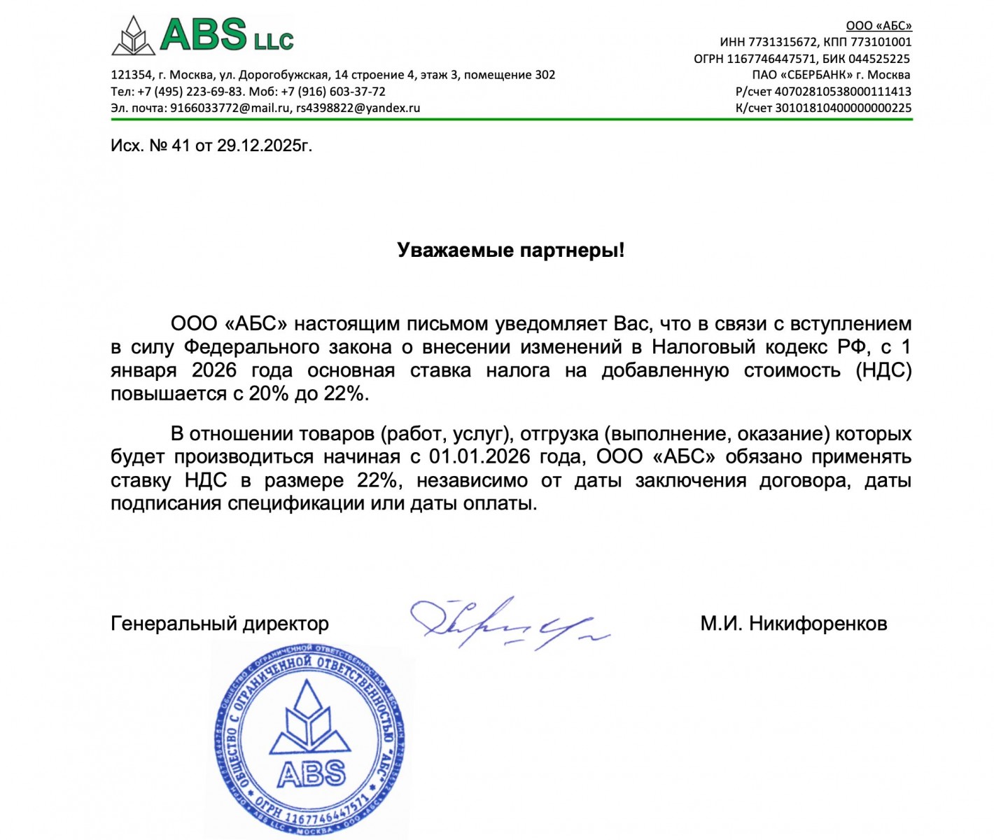 Уведомление об изменении ставки НДС с 1 января 2026 года